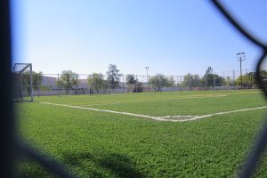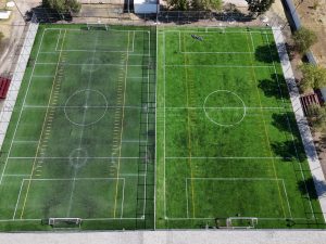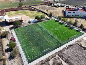 Esta obra, realizada con un monto contratado de $5,365,793.66, consiste en la construcción de una cancha en una superficie de 1916.90 m², con empastado sintético, multitrazo de futbol 7 y futbol bandera, drenaje pluvial, enmallado perimetral, equipamiento con porterías y banderolas. Asimismo, se instala un andador perimetral de 444.11 m² que abarca tanto la nueva cancha como la anterior, además de alumbrado compuesto por 16 reflectores de 500 w.