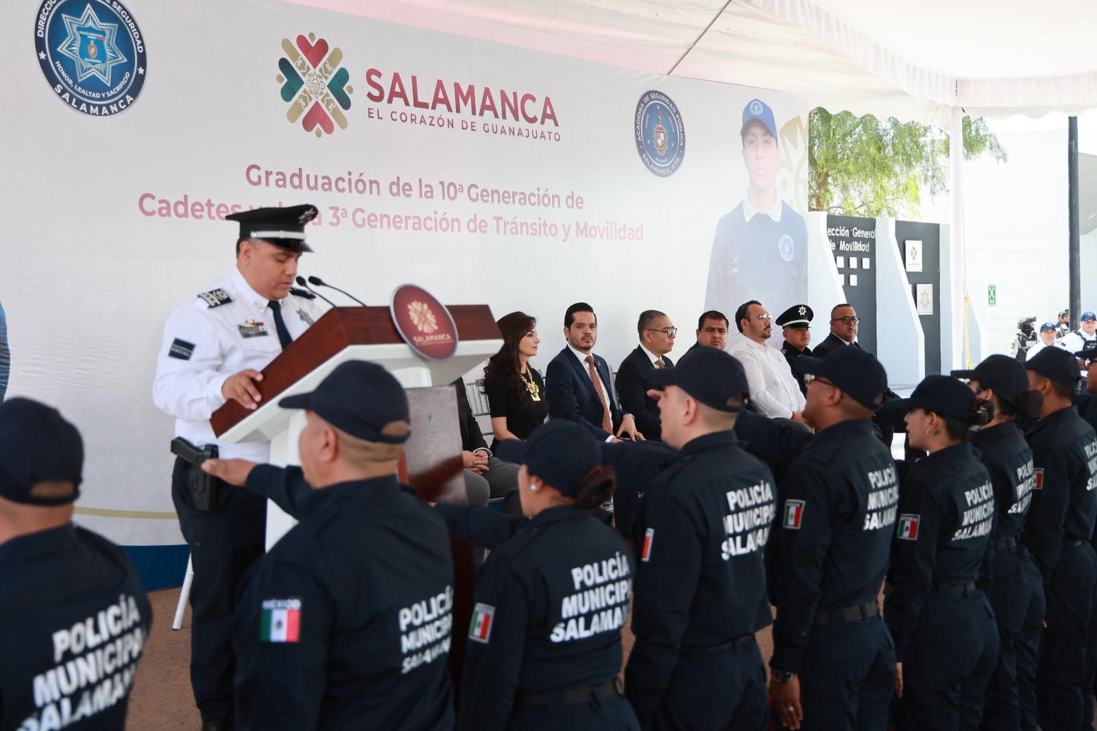 Salamanca, Gto; 19 de marzo de 2026. – “Salamanca valora profundamente la pasión y el compromiso con su trabajo que los cadetes demuestran al graduarse con la misión de proteger a la población. Este esfuerzo también refleja el apoyo de todos aquellos que han contribuido a su formación humana y profesional (…) Lo único que realmente poseemos como seres humanos es nuestra palabra y nuestro honor. Estoy seguro de que sus familias, sus padres, hermanos y todos aquellos que los conocen, esperan que ustedes sepan servir y entregar lo mejor de sí mismos”, destacó el presidente municipal César Prieto durante la graduación de 37 nuevos elementos que se incorporan a la Policía Municipal, en el marco de la Décima Generación del Curso de Formación Inicial para Policía de Proximidad y la Tercera Generación de Tránsito y Movilidad.