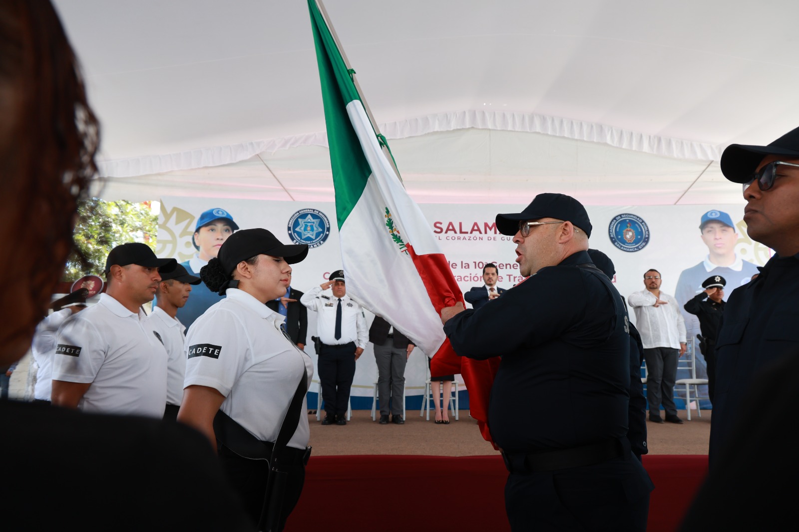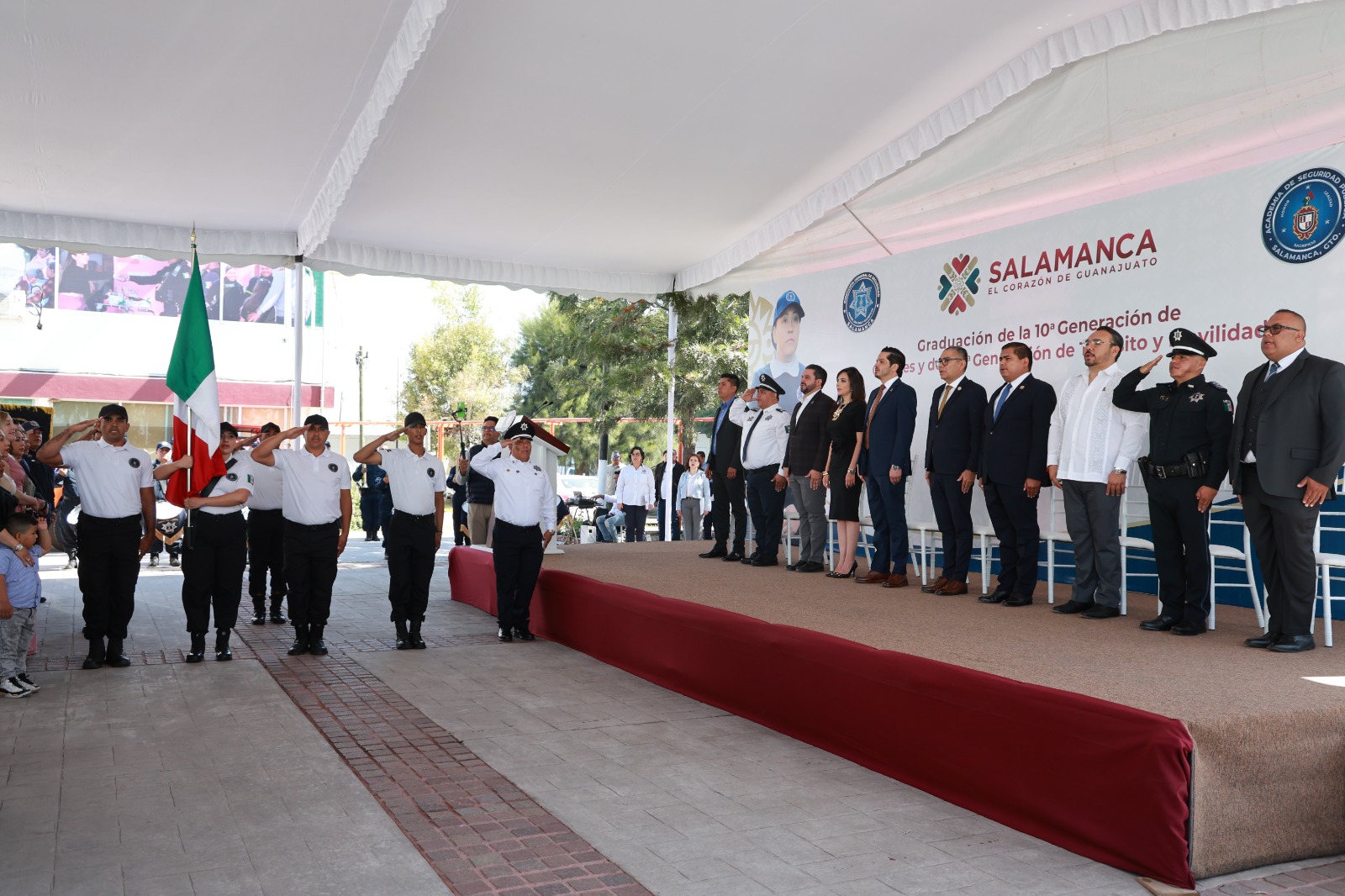 A la ceremonia también asistieron la presidenta del Sistema DIF Municipal, Eugenia Leonor Martínez Carrillo; el secretario del H. Ayuntamiento, Gonzalo Esaú Cano Calvete; el regidor y presidente de la Comisión de Seguridad, Rafael Alejandro Prieto Carrillo; el comisario Eduardo Ramos Camacho; así como el director general de Movilidad, licenciado Tadeo Emmanuel Gómez Pastrano, así como representantes del Fiscalía General del Estado de Guanajuato y SEDENA.